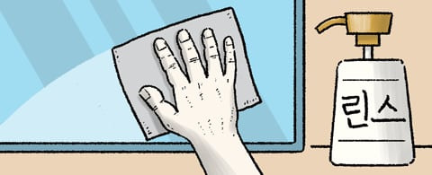 욕실 거울에 물때가 꼈을 땐 마른 걸레에 린스를 묻혀 닦아보자. 린스의 계면활성제 성분이 알칼리성 물때를 제거해주고 코팅 효과도 낸다.