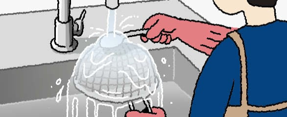 주방용 채망을 닦을 땐 물줄기 아래에 숟가락을 뒤집어서 대보자. 물이 넓게 퍼져서 망 사이에 낀 이물질이 잘 씻긴다.