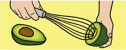 아보카도는 반으로 잘라 씨를 뺀 뒤 거품기로 손질해 보자. 거품기를 대고 꾹 누른 뒤 한 바퀴 돌리면 먹기 좋게 조각난다.